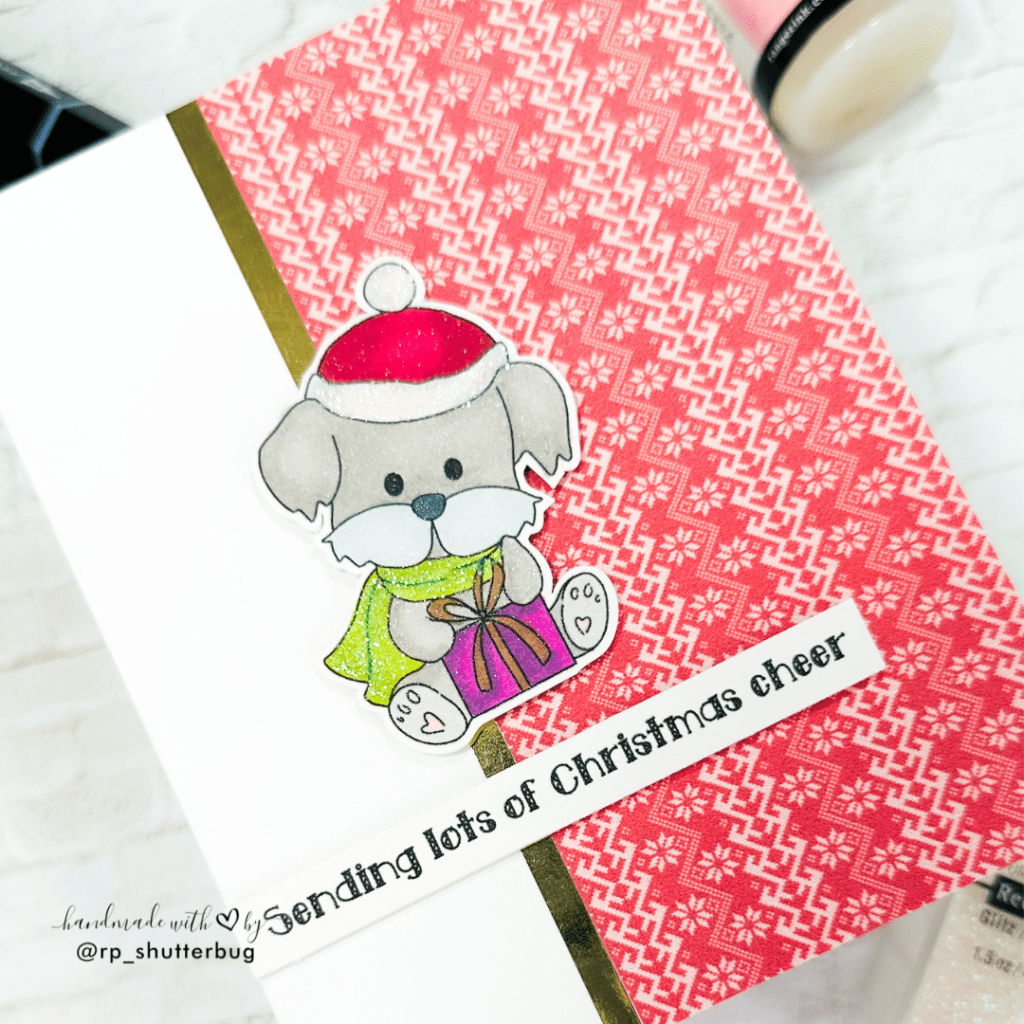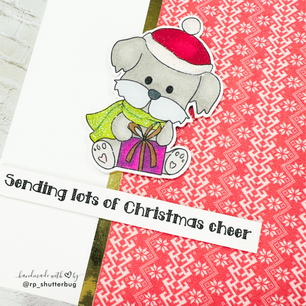 Christmas cards are never complete without some shine and sparkle. I added a strip of shiny gold cardstock by Your Paper Insider along the edge of the patterned paper. I then used this fun font “Sending Lots of Christmas Cheer” from the Christmas Greeting Sentiment Digi Stamps.