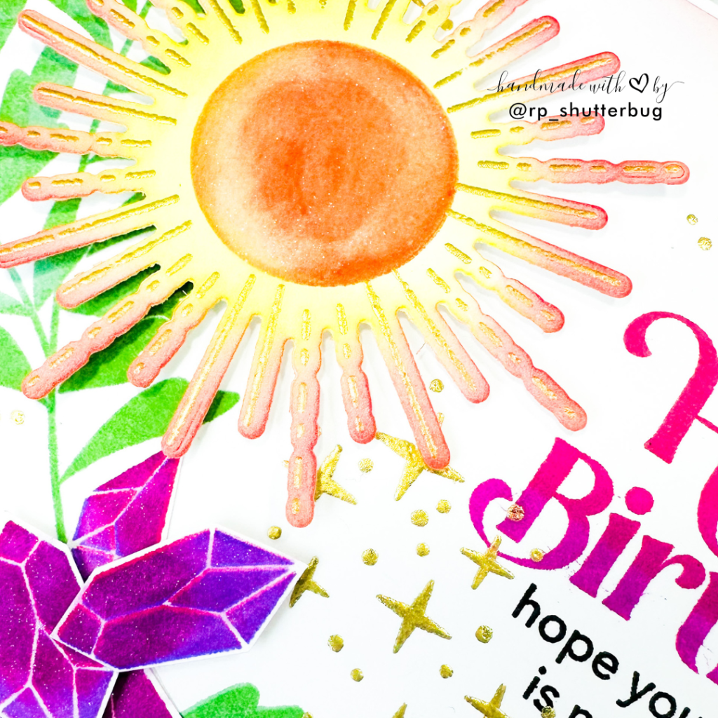 Before assembling the card onto an A2 size note card, I added a light hint of color on the edges of this panel. I used the leftover inks on my yellow, orange, pink and purple blending brushes to add some color to this stark white card front. I also added some shine to the sun and the gems using my Spectrum Noir Glitter Brush Pen.