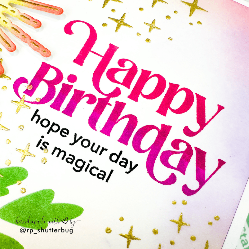 Next I took my starry sparkle background panel and stamped my sentiment first. I stamped the “Happy Birthday” Sentiment using Rose and Taffy Inks for an ombre effect. I added a little sub-sentiment “hope your day is magical”, which I thought matched perfectly with our magical theme birthday card.