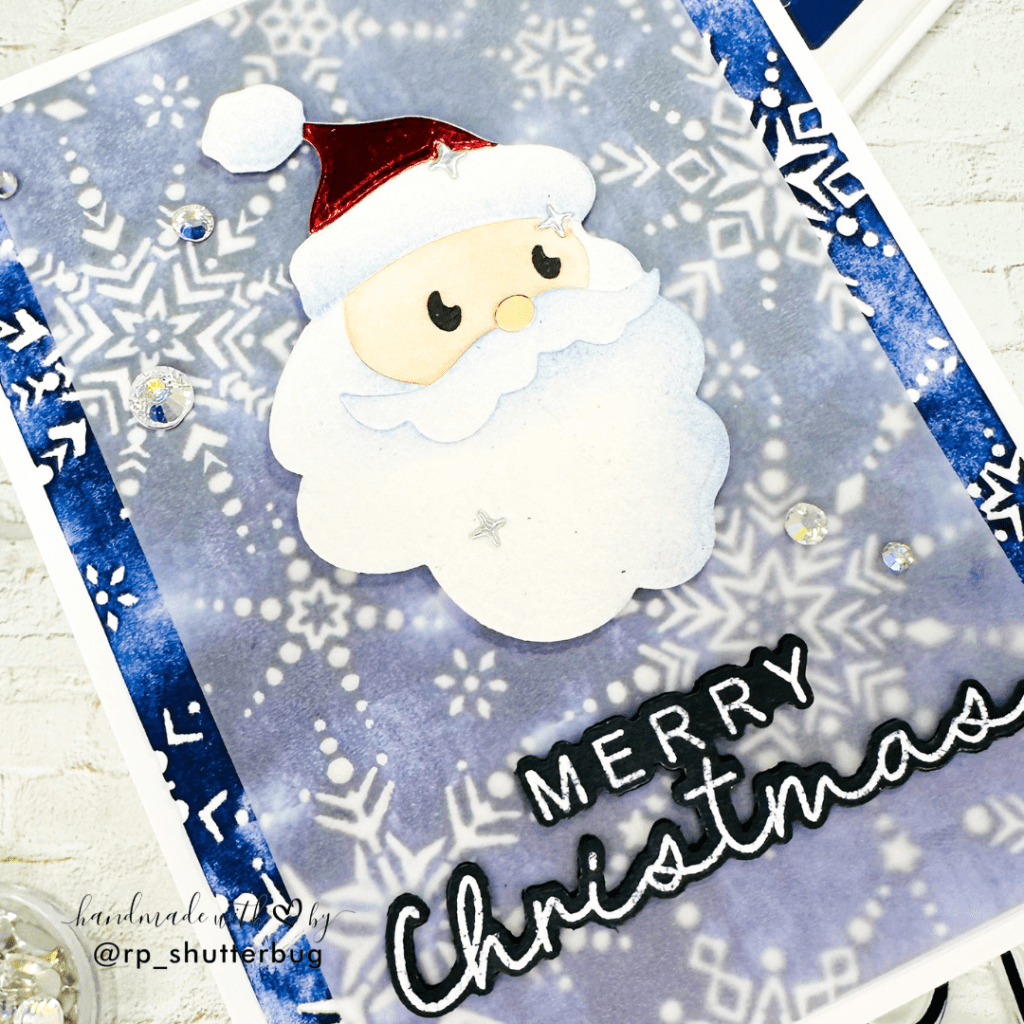 To tone down the blue and pop the santa focal point, I decided to add a strip of vellum. I feel the vellum not just pops the focal point, but also brings your eyes to focus on those gorgeous snowflakes too.