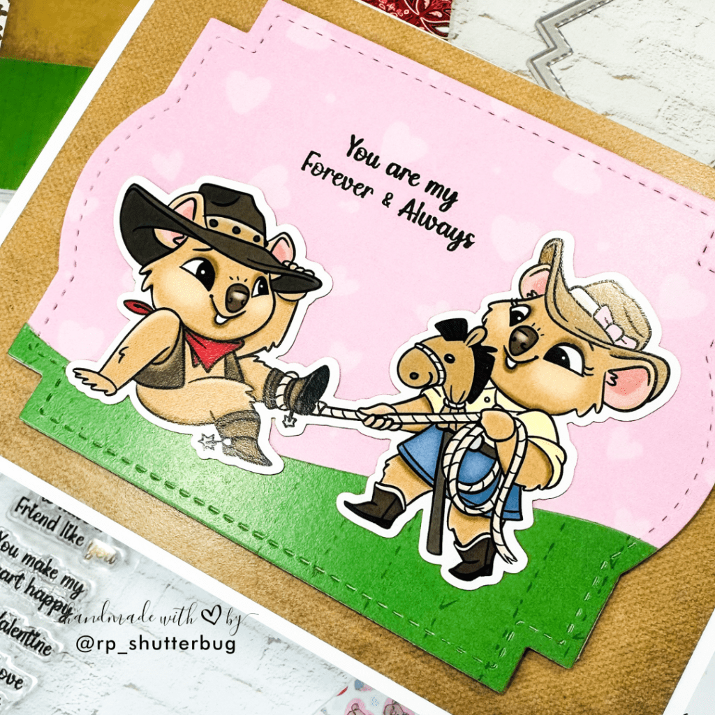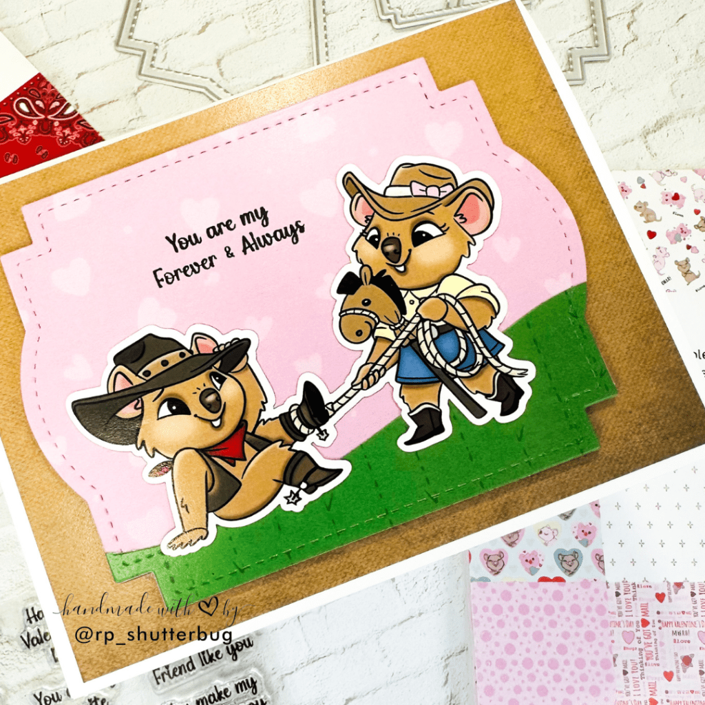 For the focal point, I used this cute quokka couple from the Cowboy Quokka Die Cut Ephemera Set. I wanted some kind of grounding for the focal point. So I cut a hill from the Cowboy Quokka Paper Pad using the A2 Stitched Hills Die and then to make it part of the frame, I cut it using the Label Frames Crafts Die too.