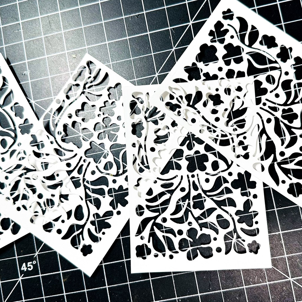 I cut these florals 4 times using an 110 pound white cardstock, since I wanted something heavy and sturdy on my frame. I never ended up using these negatives, but I do have it stored along with some other incomplete projects and hope to use it on a card front soon.