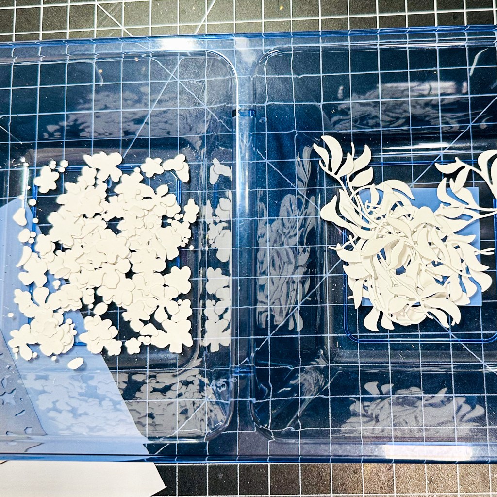 I stored all of the tiny little die cut pieces in this container that I got from the Dollar Tree. I did separate all of the flowers from the leaves, to make my work a lot easier when I went to color them, since these are fairly smaller than your average die cut flowers.