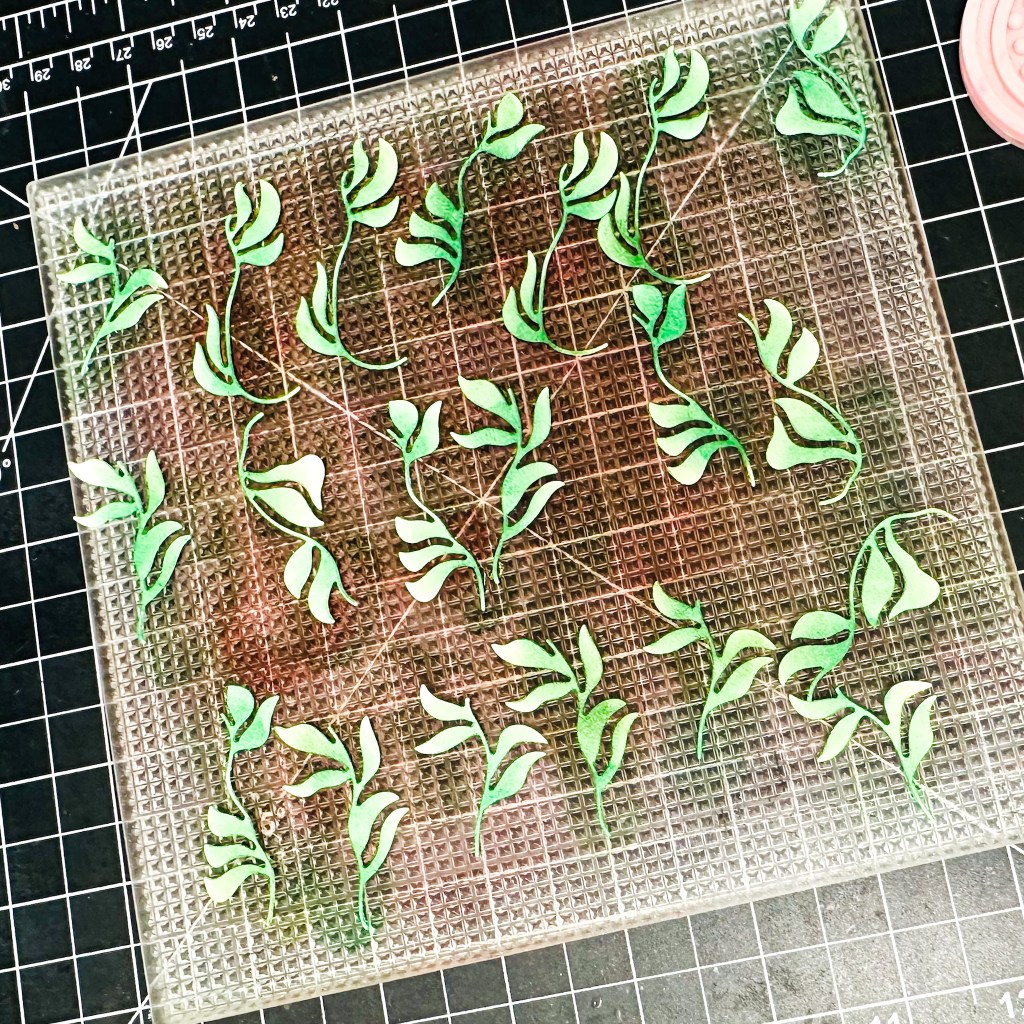I used 2 shades of greens. Also, the thing I love the most about adding your own choice of ink on white die pieces is that every little leaf looks different. The intensity of color, the shades, are all different.