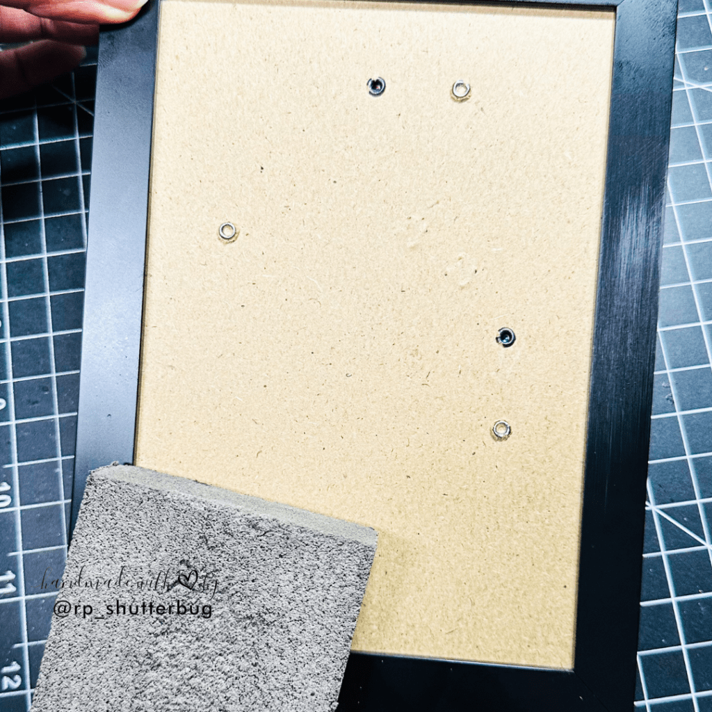 I ran the sanding block on the edges of the frame and to my surprise, these scratches looked very similar to the scratched edge on the frame. I continued rubbing the frame with the sanding block until I was able to create a rough texture on the frame.