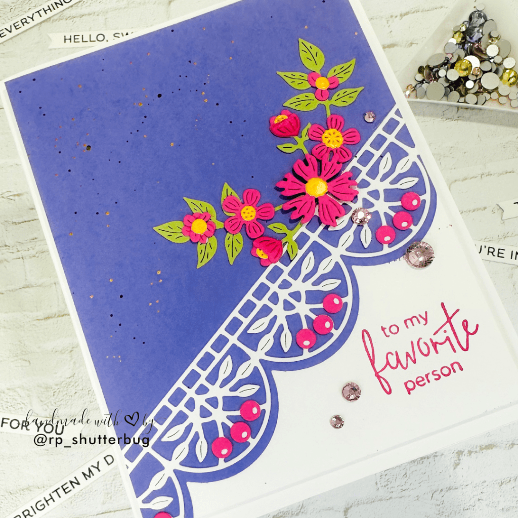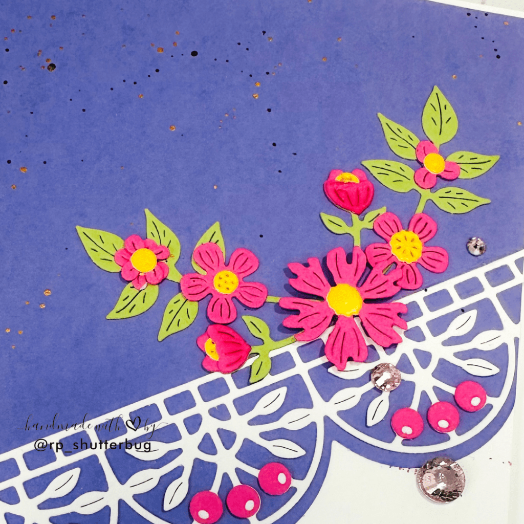 I started with a fun and delicate scalloped border. I cut the border first using a purple card panel and used white cardstock for the intricate border. This is the Berry Fields Border Etched Dies from the Vivid Expression collection. This die cuts out a beautiful berry and leafy border. I cut the berries using pink cardstock, which added a contrast to the card front.