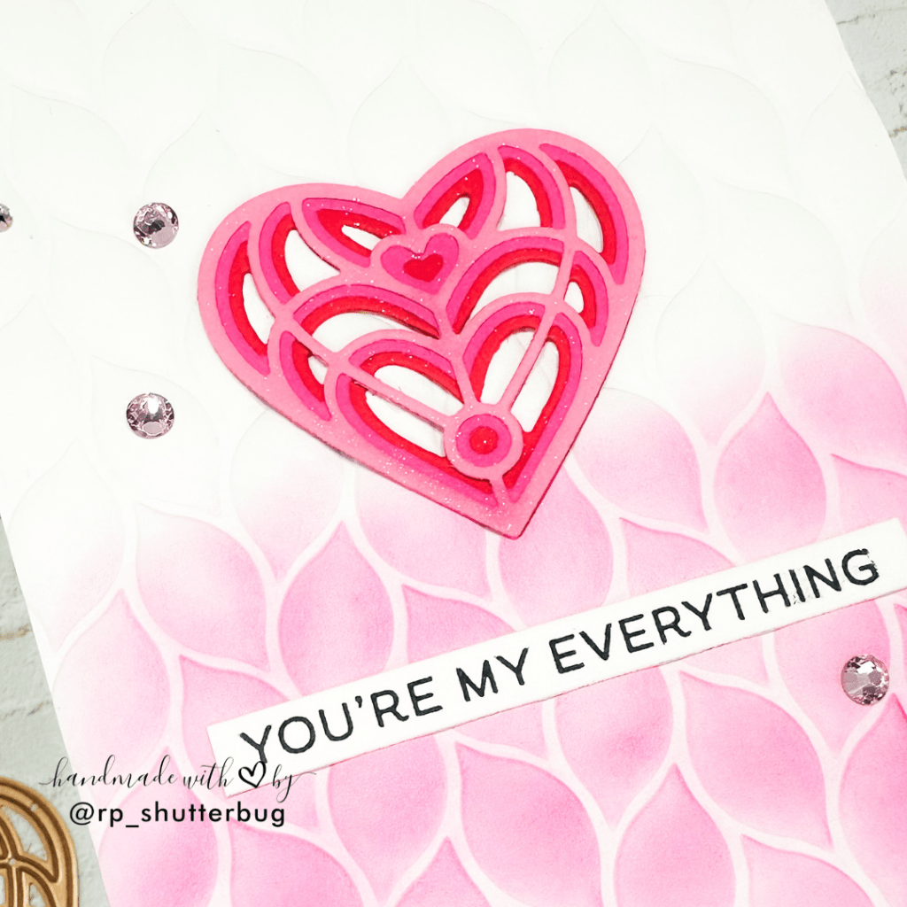To begin this card, I used the beautiful heart-shaped layering die from the Kaleidoscope Noble Suits Etched Die Set. I chose shades of red and pink for the layers to keep everything within the same color family, giving the focal point an elegant and cohesive look.