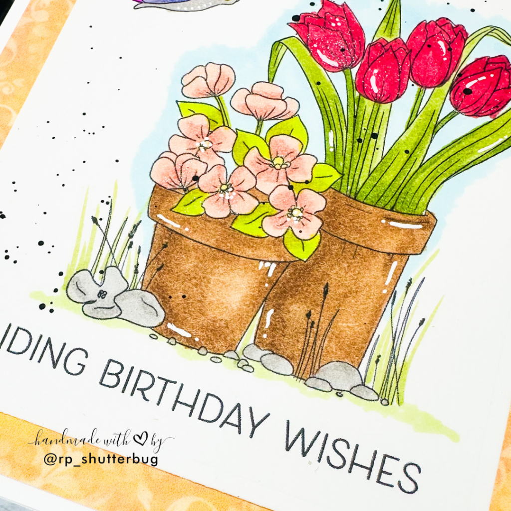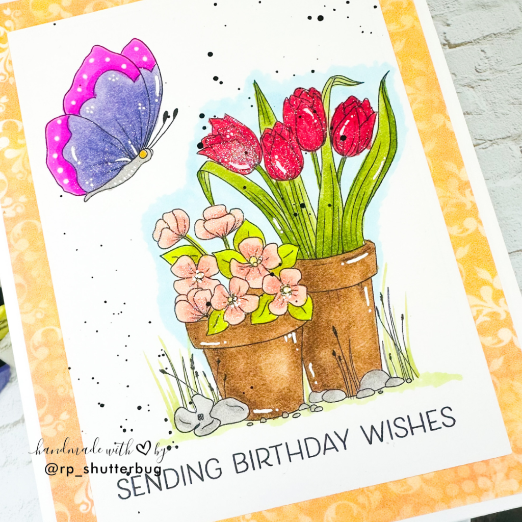 For this design, I used the Butterfly Flowerpot Bundle digital stamp to create a lively garden scene, complete with bold, bright blooms and the sweetest little butterfly. The image was brought to life using my Spectrum Noir TriBlend Markers, which gave me beautiful, seamless blends and vibrant hues. To add that extra magical touch, I used a glitter brush pen to highlight some details, giving the entire card a subtle sparkle that catches the light just right.