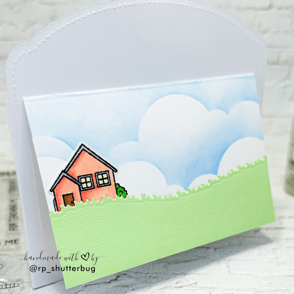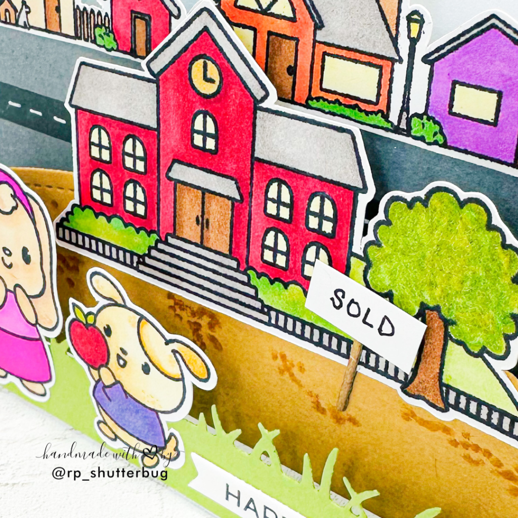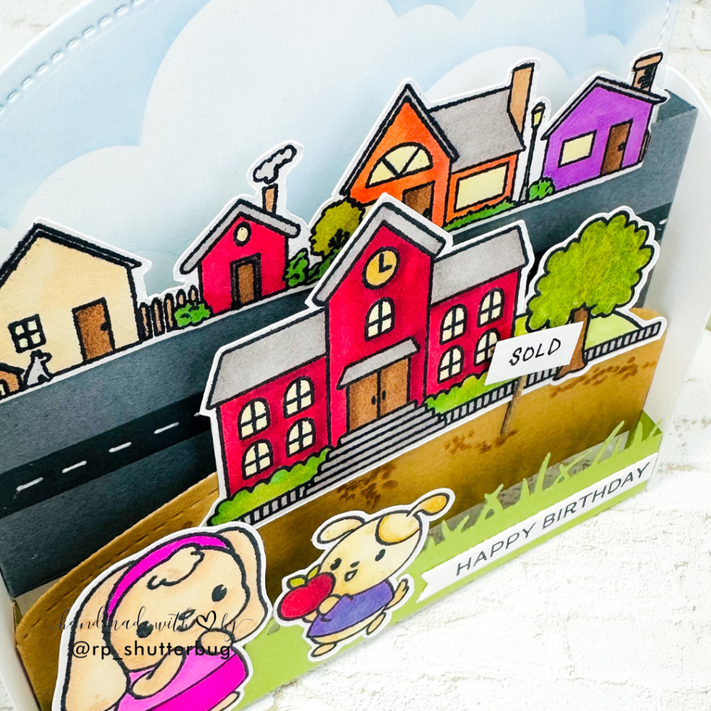 Starting with the grass tier, I carefully added each layer, ensuring the stamped images were spaced in a way that kept everything visible and well-balanced. Because this card was created for a friend in real estate, I added a playful little “SOLD” sign. I repurposed a mini tea bag die from Kat Scrappiness, trimmed it down, and hand-lettered the word “SOLD” using a black gel pen to place in front of one of the buildings.