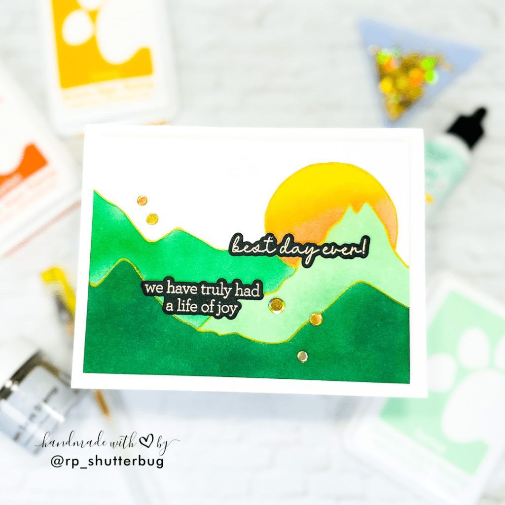 Card #3 – I created a stunning layered scenic background using the Mountainscape Stencil, adding depth and dimension to the design.