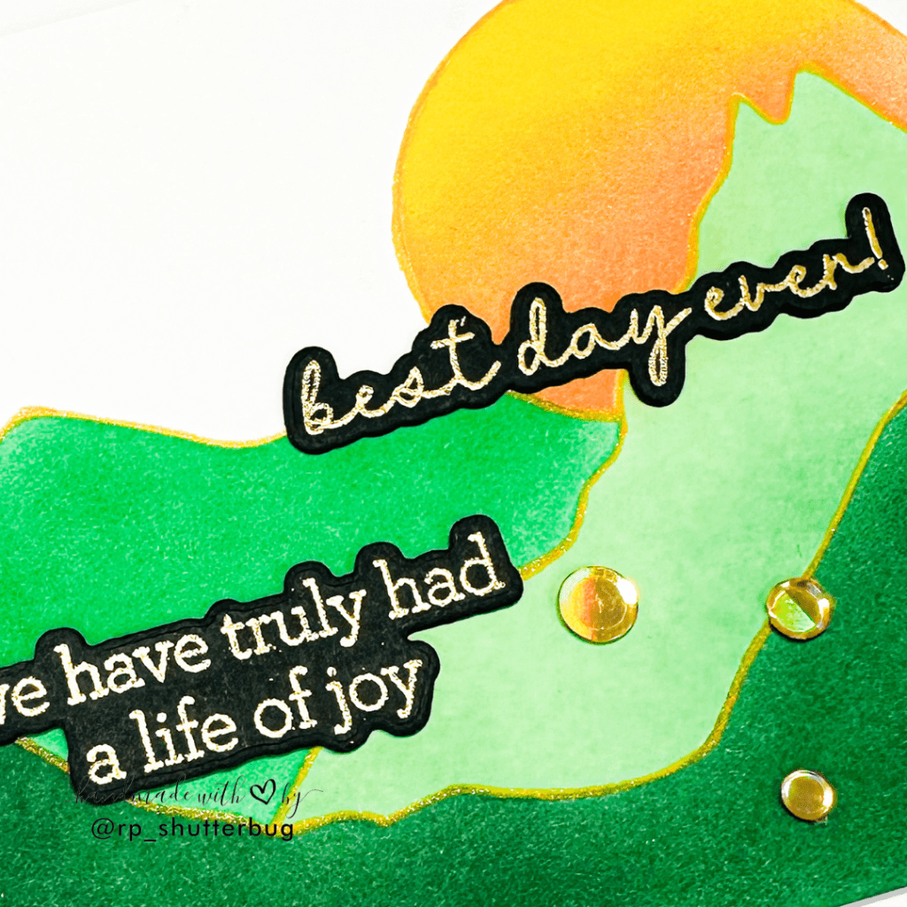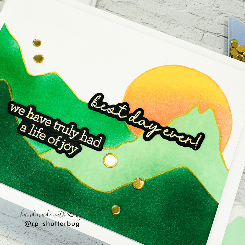 For the sun, I opted for a vibrant gradient blend of Citrine and Sherbet inks, bringing warmth and life to the background. To elevate the scene with a subtle touch of sparkle, I outlined each mountain layer using a gold glitter gel pen from Violet Studio — a simple detail that adds so much charm.