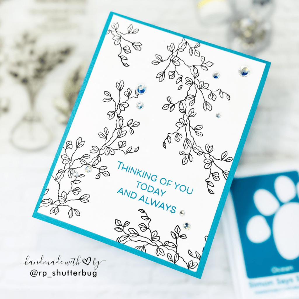 I began by stamping the sentiment using SSS Pawsitively Saturated Ink in the shade Ocean. Next, I built up the design by stamping the delicate floral image around the sentiment to frame it beautifully. To finish, I added a few Prism Pawsitively Dazzling Gems for a hint of sparkle and elegance.