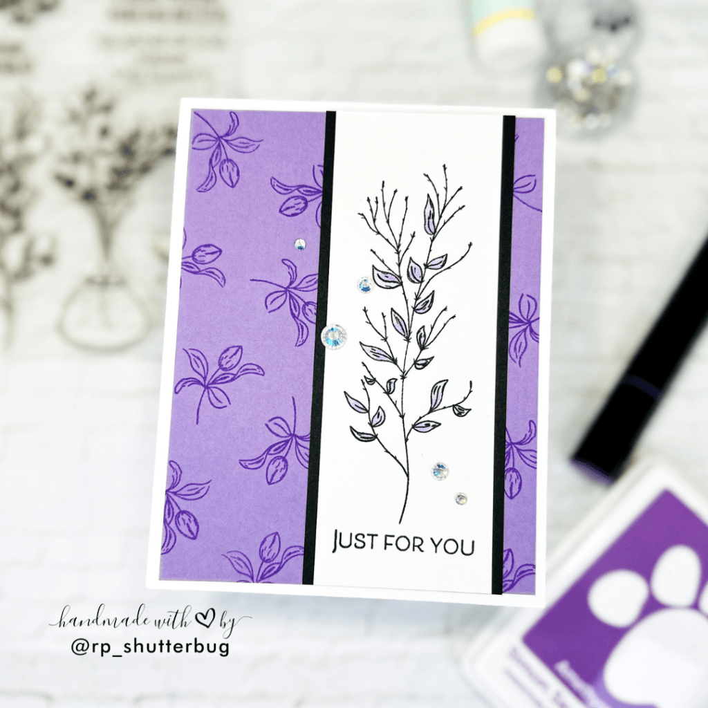 Continuing the theme of repeat stamping for the background, I stamped the small floral image onto a Heather cardstock panel using Amethyst ink. Then, I stamped the larger, more delicate floral image onto a white cardstock strip and added the sentiment just below it. To create some visual contrast, I layered the white strip over black cardstock and finished the card with a few Prism Pawsitively Dazzling Gems for a touch of sparkle.