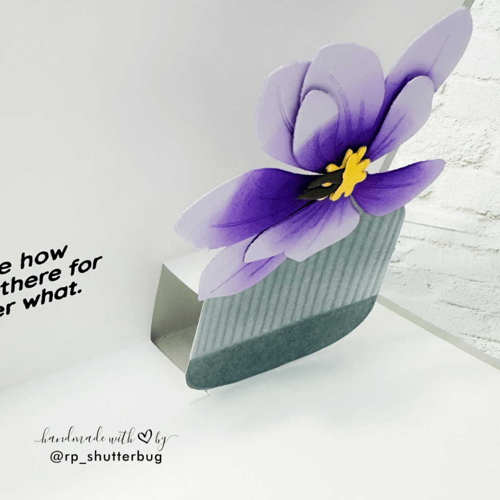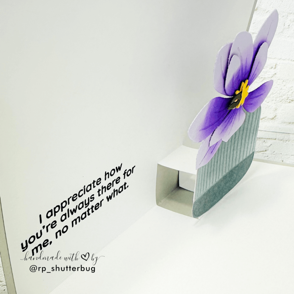 Before attaching the die-cut floral piece to the pop-up mechanism, I wanted to add a heartfelt touch to the inside of the card. I chose a sentiment that reads, “I appreciate how you’re always there for me no matter what.” Its simplicity and sincerity felt like the perfect match for the soft, elegant design I had in mind.