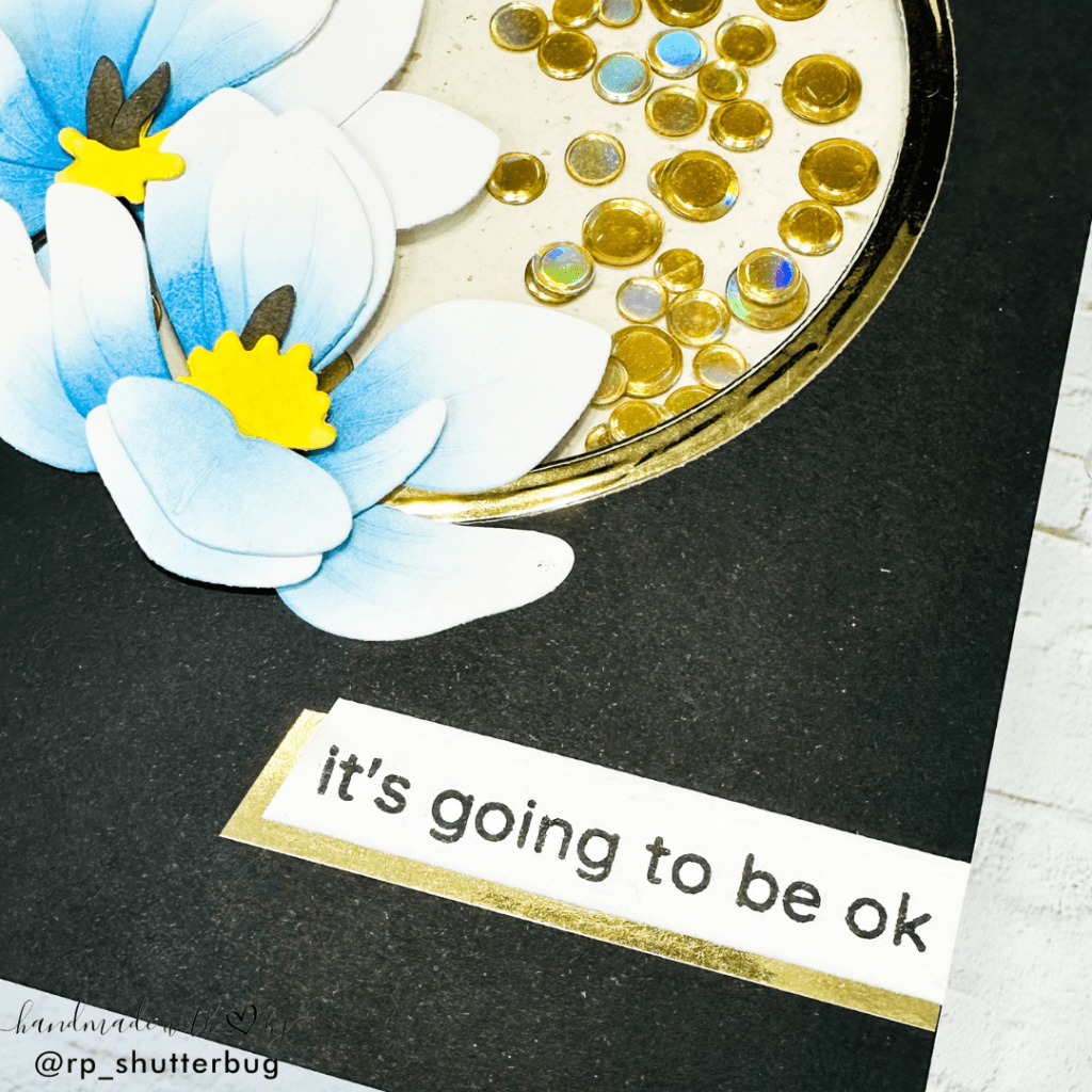 Finally, I stamped the sentiment, “It’s going to be OK,” onto white cardstock and layered it over a strip of gold cardstock—the same gold I used for the frame—to bring everything together with a cohesive touch.