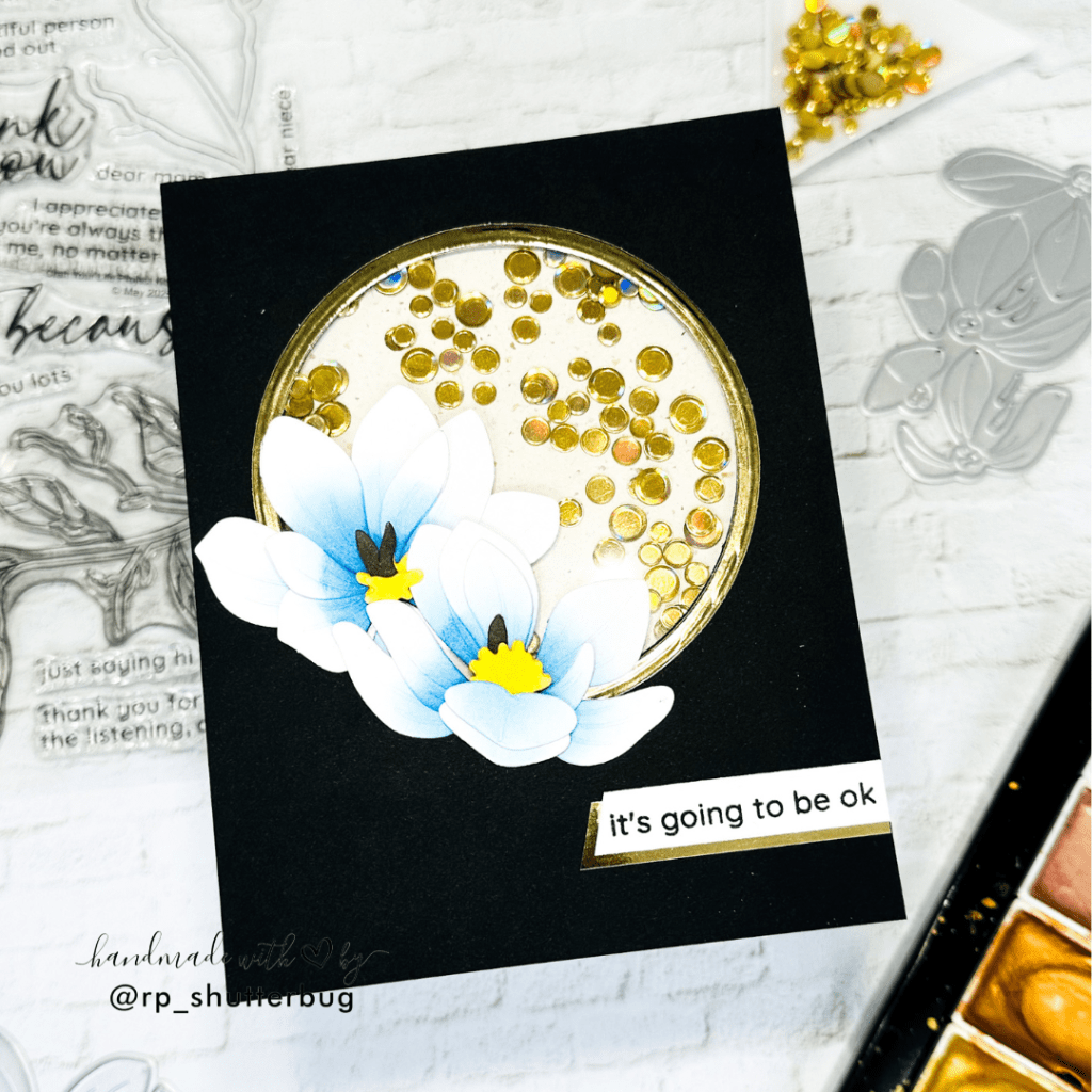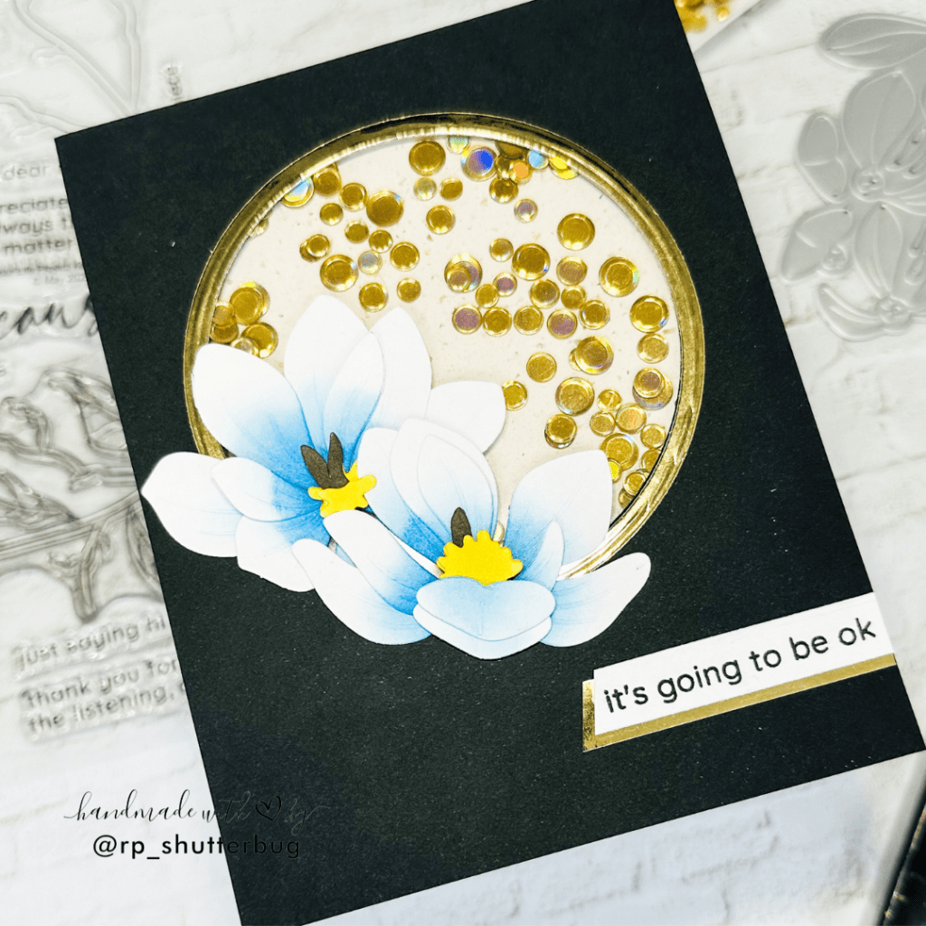 While I usually gravitate toward clean and simple, single-layer cards, interactive designs like window shaker cards always spark my creativity. For my first project, I combined the playful elements of a shaker card—bling, embellishments, and all—with a minimal and elegant design featuring a floral die cut and a classic sentiment strip.