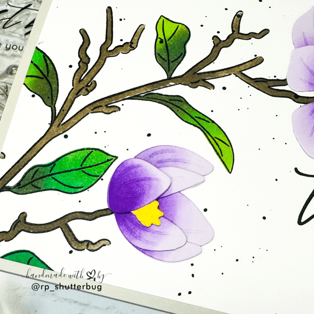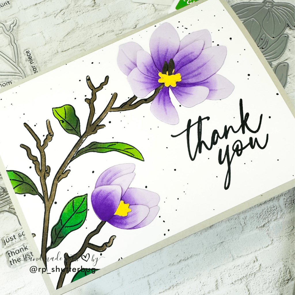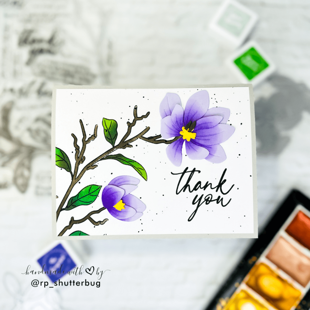 I kept the front of the card clean and simple, featuring a beautifully stamped branch paired with a die-cut floral element and a “thank you” sentiment—both from the Magnificent Magnolias bundle. Before adhering the floral accents, I added a few black watercolor splatters to the panel for a subtle touch of texture and contrast.