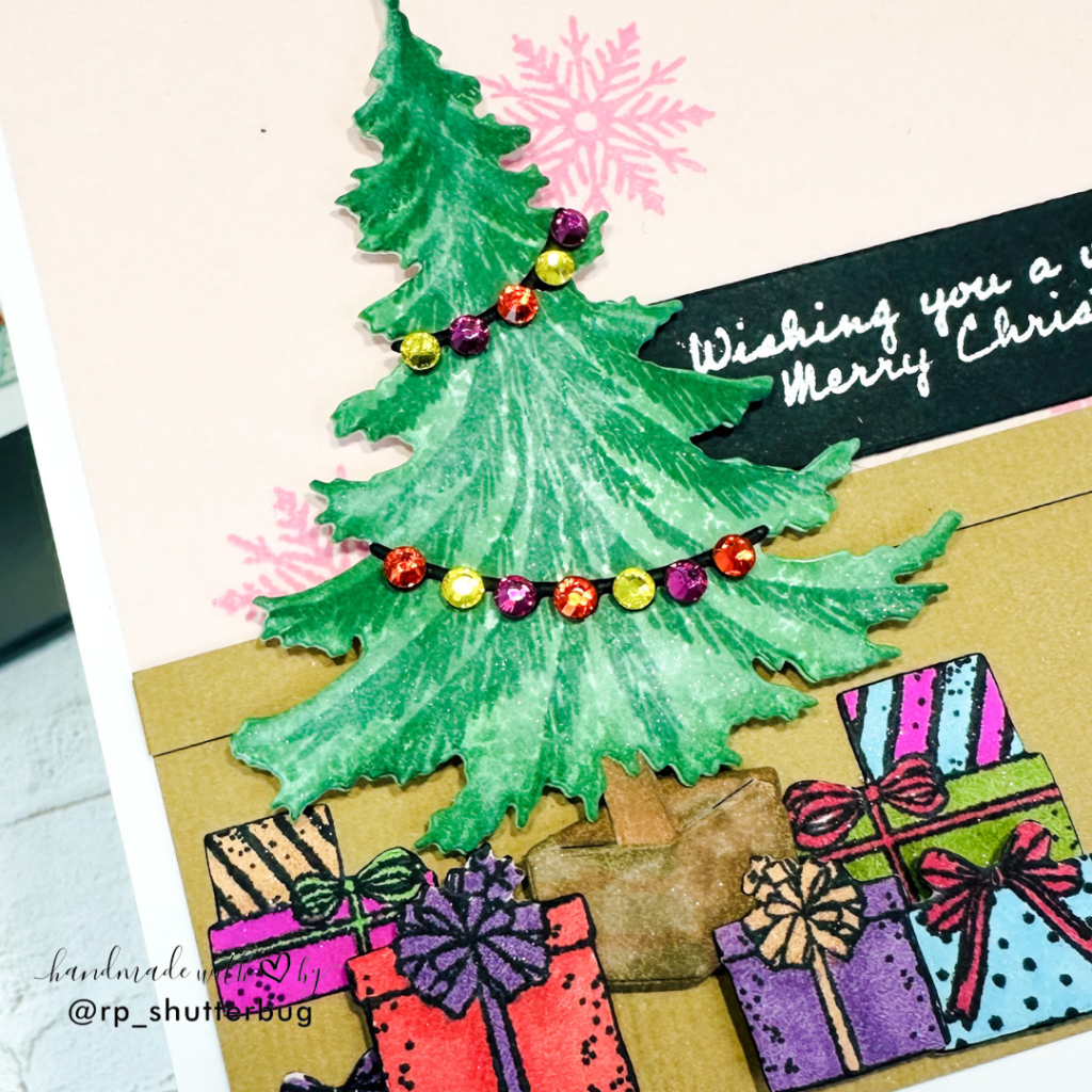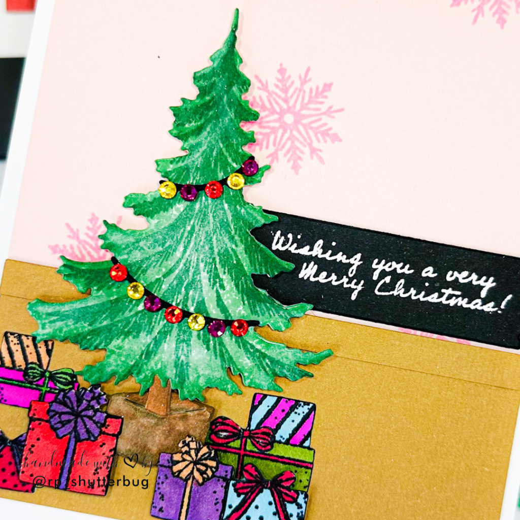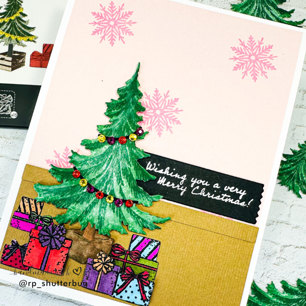 For my first card, I wanted to capture the warmth of a magical Christmas Eve. I used the Trees and Trinkets Stamp and Die Set to create a layered, realistic-looking Christmas tree and a stack of gift boxes ready for the big day.