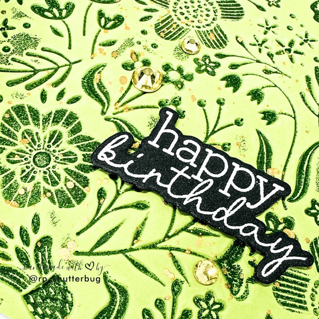 Once the panels were inked and embossed, I added sentiments to each card. For the lighter panel, I used a black “Happy Birthday” stamp for contrast, while the darker panel received a white embossed sentiment strip to make it pop. A few scattered pastel-toned gemstones added a final touch of sparkle.