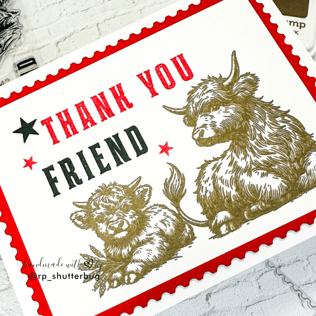 The second card follows a similar layout but with a slight variation. I stamped two cows facing each other in Mocha ink to create a different focal point. For the sentiment, I layered “Thank you” and “Friend” using black and red inks. Masking with a Post-it note helped me achieve precise placement. I also added a few stars in black and red to complement the sentiment and create visual balance.