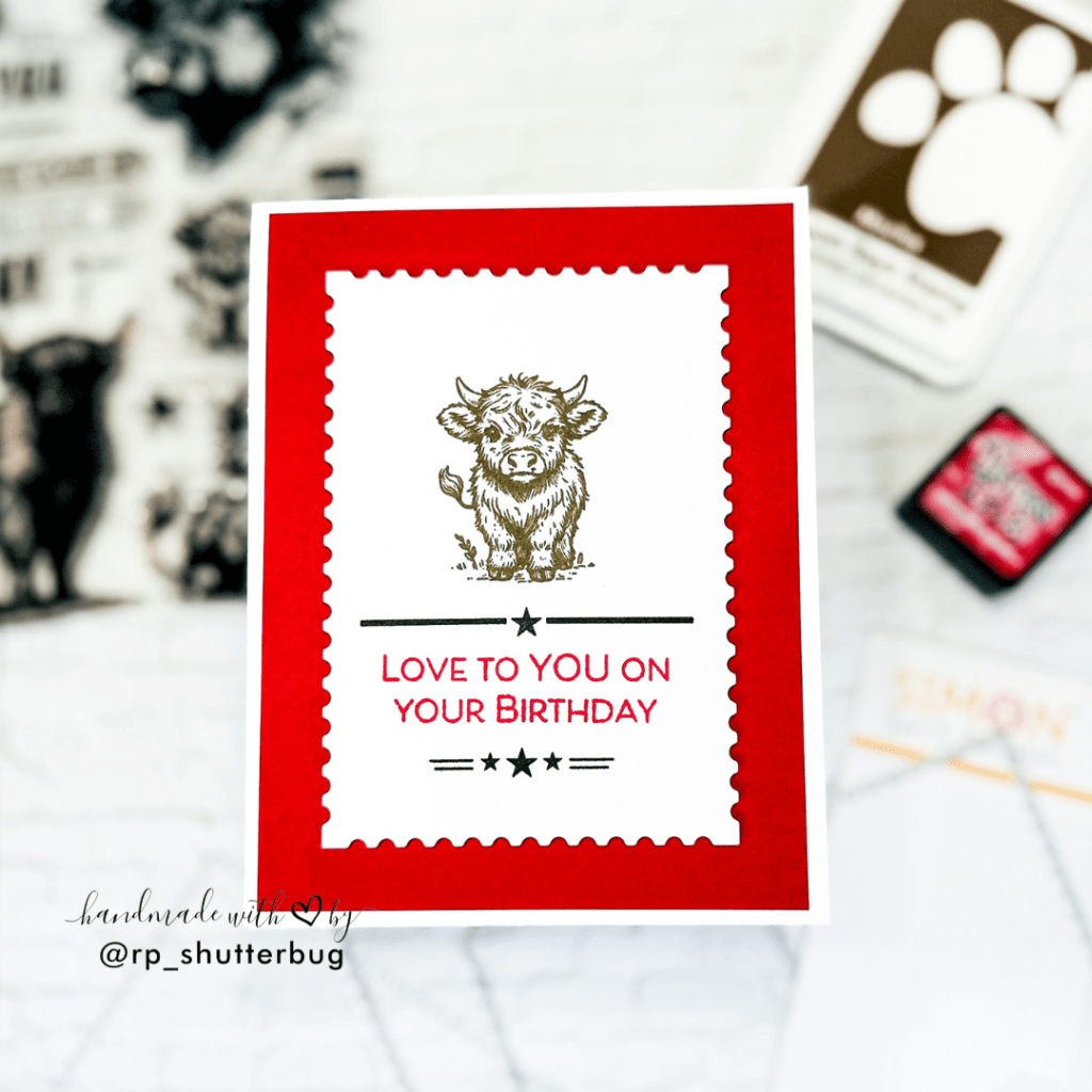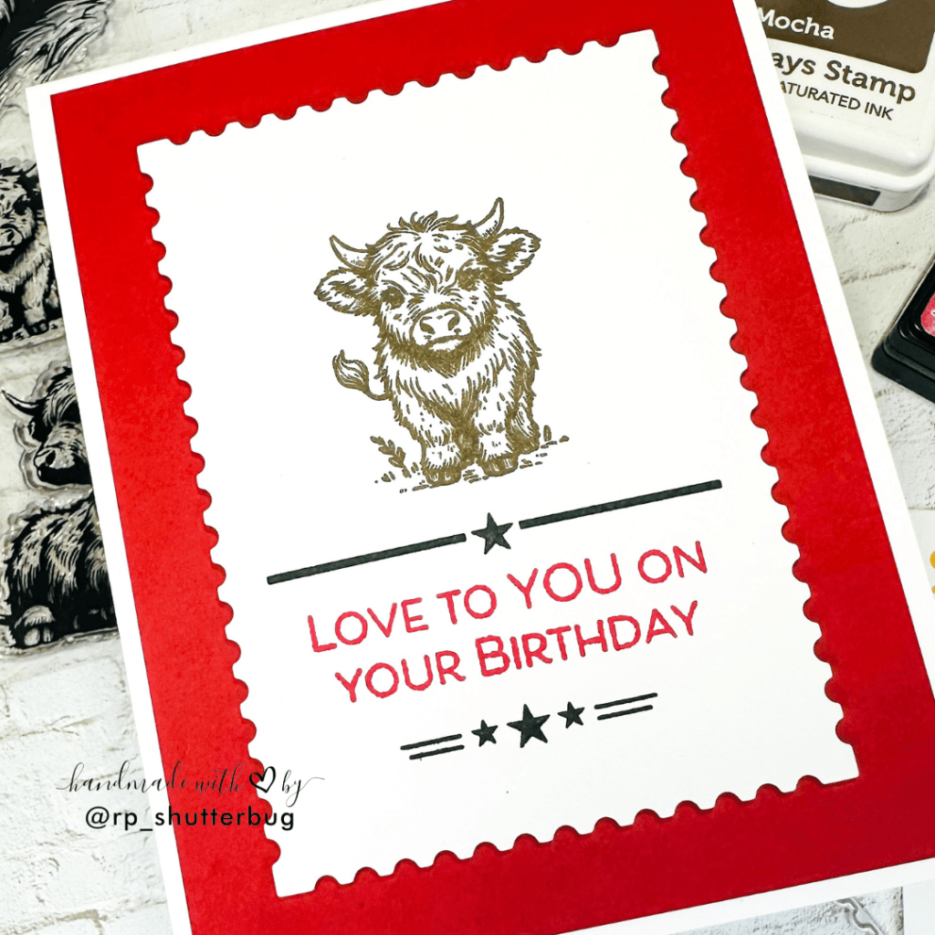For the first card, I stamped the main sentiment in Lumberjack Plaid Distress Ink, adding a small sub-sentiment for a playful touch: “I herd it’s your birthday.” The focal image is a large Highland cow stamped in Mocha Positively Saturated Ink, left uncolored for a rustic, clean look. To finish, I added small stars from the stamp set in red to frame the sentiment and balance the composition.