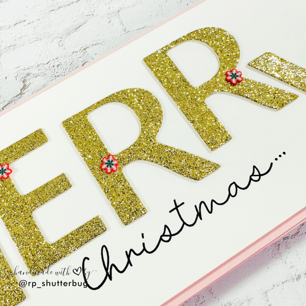 Once everything was arranged, I slightly staggered the letters to add movement and interest. I adhered the finished panel to the card base with foam tape and added a touch of sparkle using the Sparkling Poinsettia Sprinkle Mix by KS—placing one tiny poinsettia on each letter.