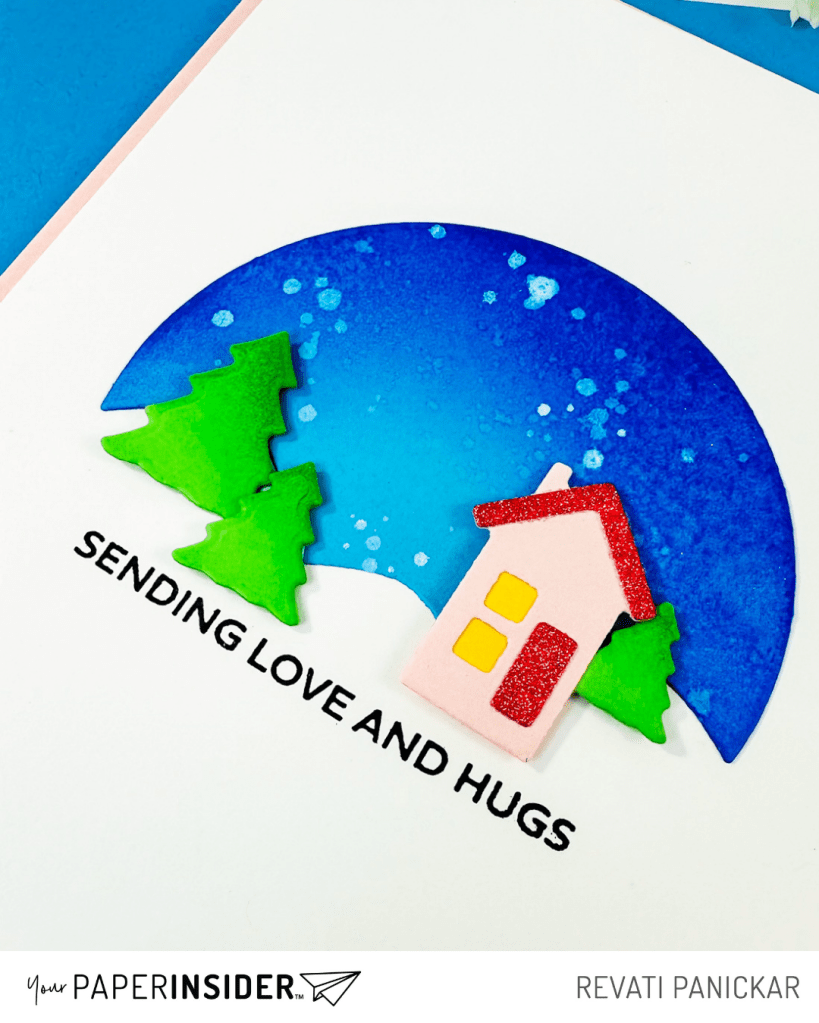 Before assembling the scene, I stamped the sentiment “Sending Love and Hugs” from the Flourishing Garden stamp set. I love the delicate font—it pairs perfectly with this tiny winter village. Using my stamping platform and Versafine Onyx Black ink, I stamped the sentiment twice for a bold, crisp impression.
