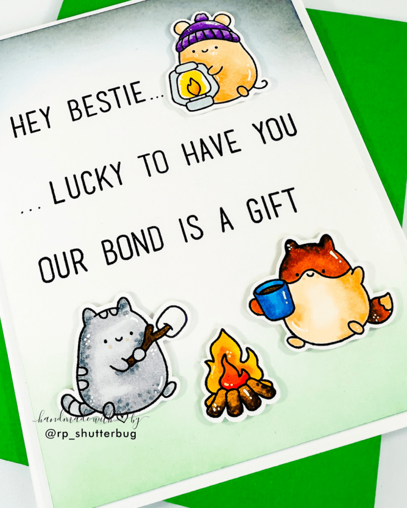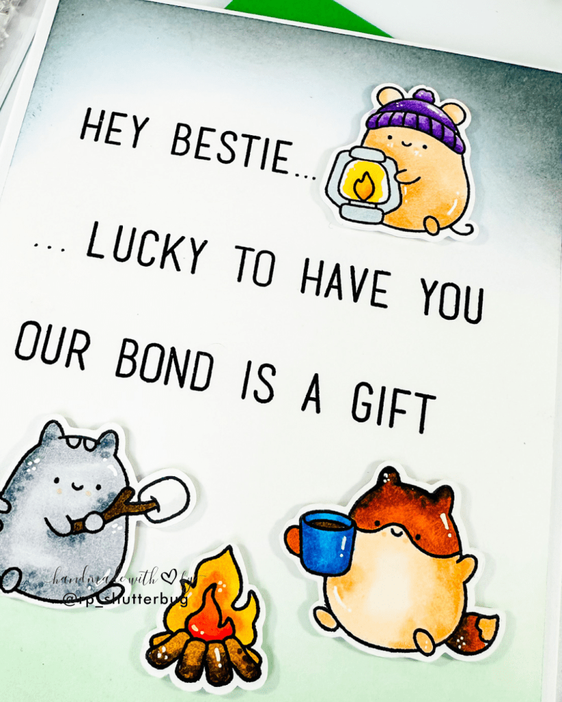 For the background, I softly blended Perfection Shade for the green ground and Twilight for the sky, adding a touch of black at the top to suggest nightfall. I kept it subtle to keep the sentiments and critters as the focus. To add dimension, I used thin foam circles behind each critter, then adhered the panel to a top-folding A2 card base with more foam tape. Finally, I added three black dots near the sentiments and highlights on the critters and campfire with a white gel pen—small details that really bring the scene to life.