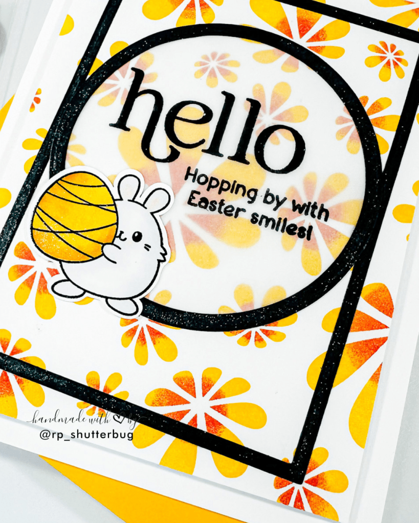 For this sweet Easter card, I really wanted the background to be the star of the show, so I started by stamping the Groovy Daisies Background Stamp using a vibrant combination of Zest and Sherbet Pawsitively Saturated Inks. The result is a sunny, retro-inspired floral pattern that just feels like springtime.