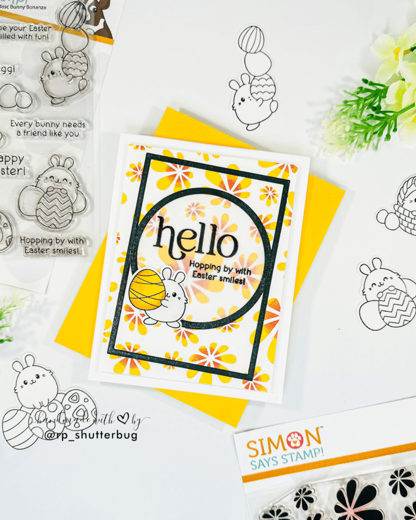 I had so much fun mixing and matching my sets for this one, pairing the bold “hello” from the Basket of Blooms Stamp with a sweet sub-sentiment and that adorable little egg-toting rabbit from the Bunny Bonanza Stamp set.