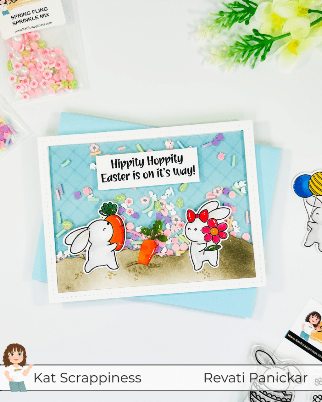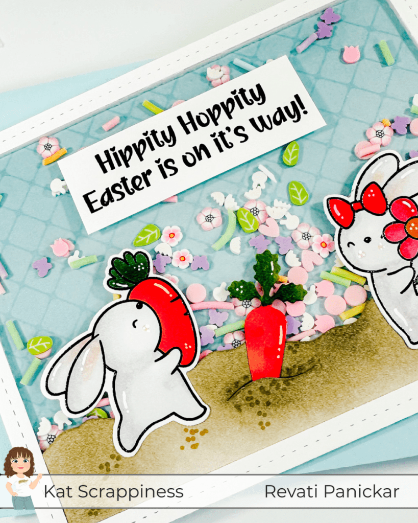 For the shaker window, I added foam tape around the frame to create dimension and filled it with a mix of Hoppy Days and Spring Fling sprinkles. Light anti-static powder ensured the bits move freely, and careful placement of the bunnies and carrot keeps the scene balanced. A heat-embossed sentiment finishes the card, creating a charming, playful Easter project that’s full of springtime joy and movement!