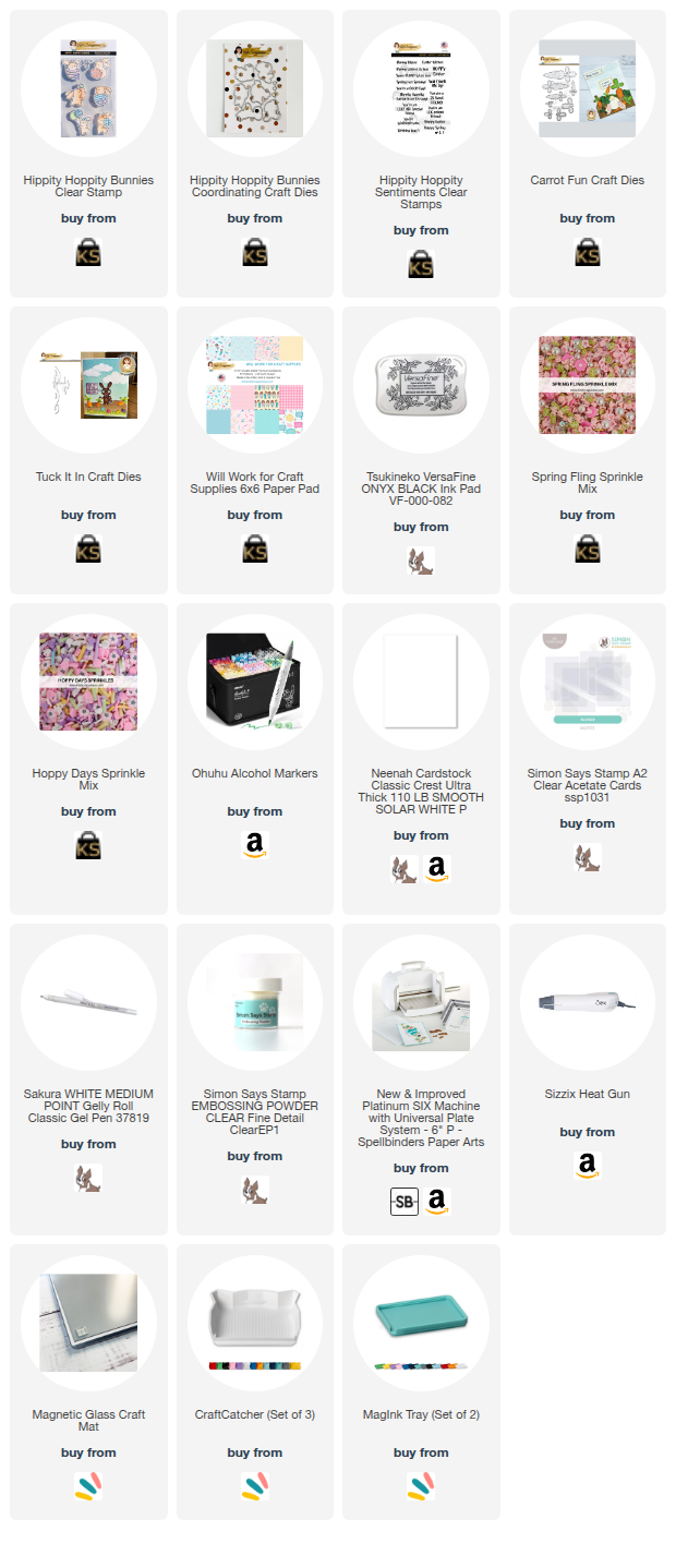 I used the adorable Hippity Hoppity Bunnies stamp set and die cuts to create a sweet scene featuring little bunnies, a carrot, and soft pastel sprinkles. The bunnies were stamped, heat embossed, and colored with Ohuhu alcohol markers, with tiny pink cheeks and white gel pen highlights to make them really pop.